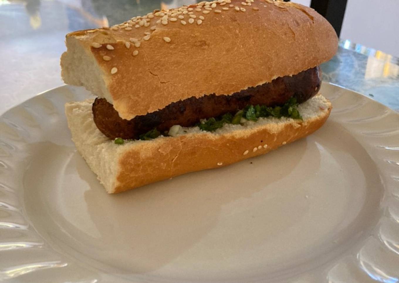 - Cortar nuestro pan por la mitad y llevarlo a dorar en un sartén. Poner una capa de chimichurri a nuestro pan y colocarle la salchicha.