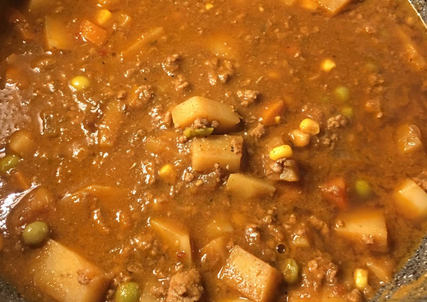 - Después de estarse cociendo por unos minutos se agregan las papas reservadas y una taza de verduras congeladas (zanahoria, chicharon y elote) y cocinar por unos 15 minutos o hasta que empiece a hervir a fuego medio. aquí ustedes deciden si quieren cocinarlo por más tiempo, para que el caldillo se concentre más.