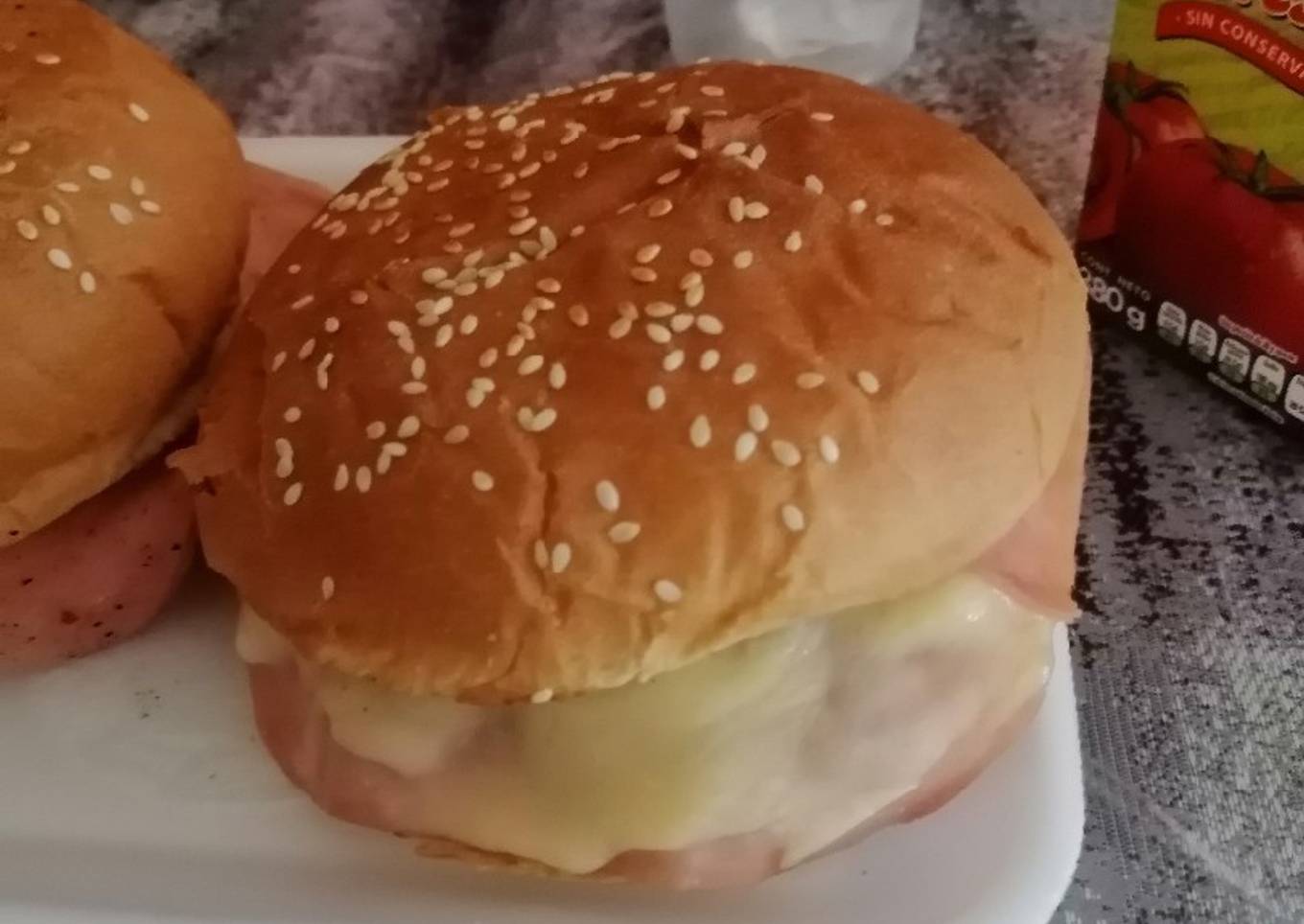 - Sella la carne por ambos lados 5 minutos a fuego medio/alto y luego al retirarlas del fuego envuelve con papel aluminio, yo utilicé 2 rebanadas de jamón y 1 de queso que puse en la plancha antes de armar la hamburguesa