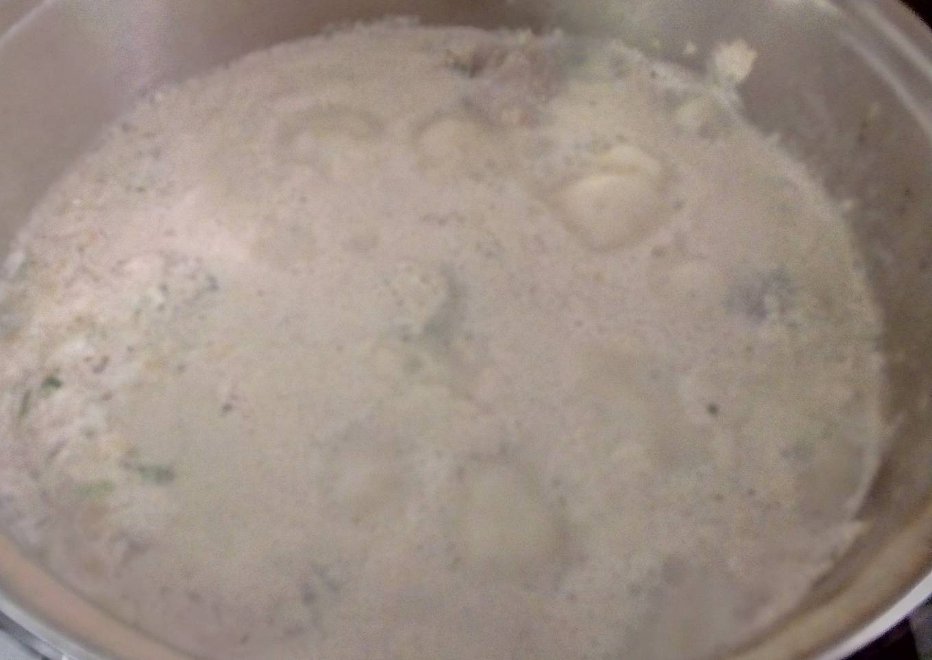 - La mezcla debe de quedar firme para así formar las albóndigas, estás vamos a ponerlas dentro de una cacerola donde a esta cacerola le pusimos la leche, la crema, knorr Suiza y revolvemos con una cuchara para se disuelva bien la crema y el Knorr Suiza, ahora pongamos a cocinar.