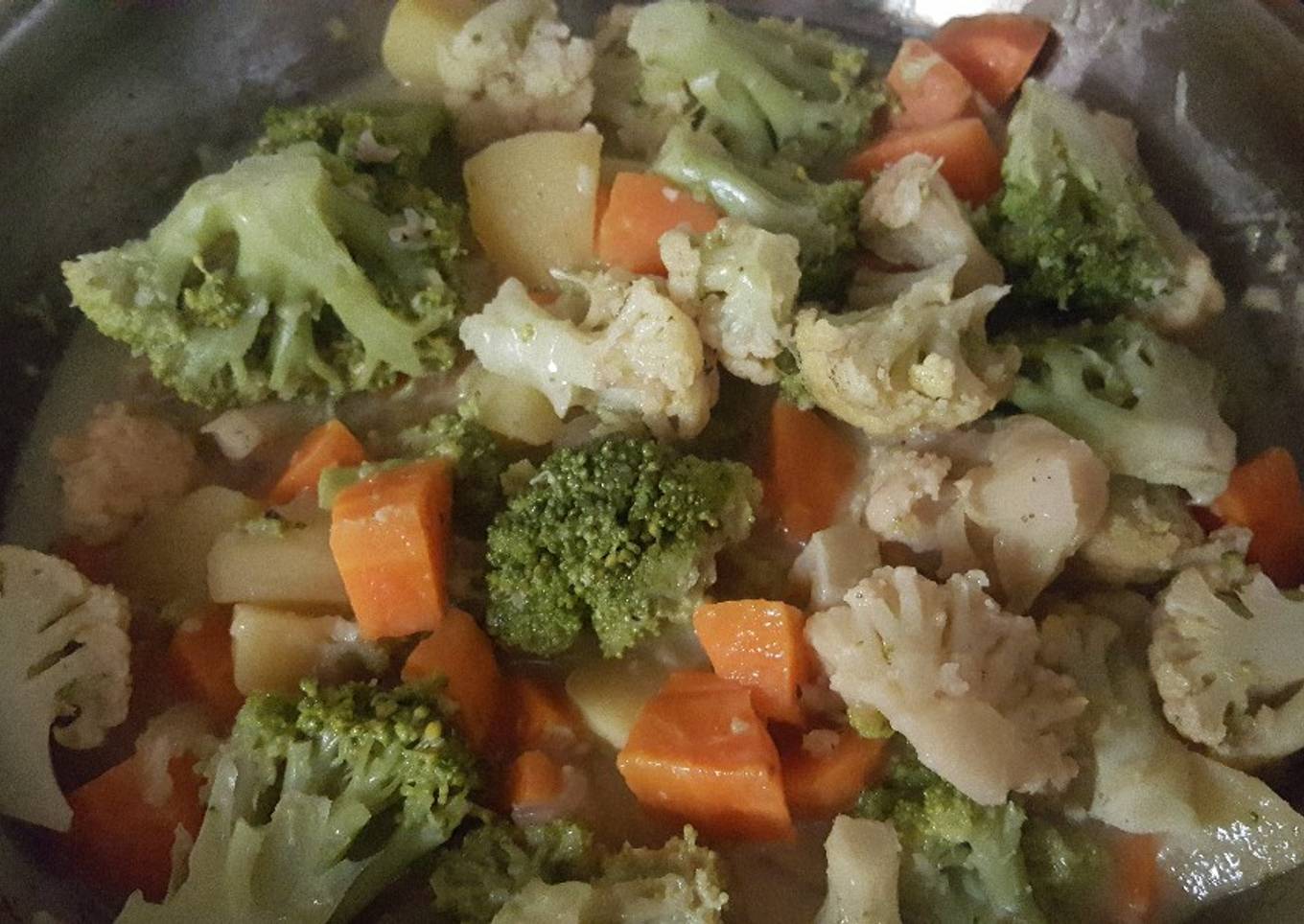 - Disuelva los cubos de caldo de res en una taza y media de agua, vierta en los vegetales y agregar los brócolis y coliflor. Mover para integrar todos los ingredientes.
