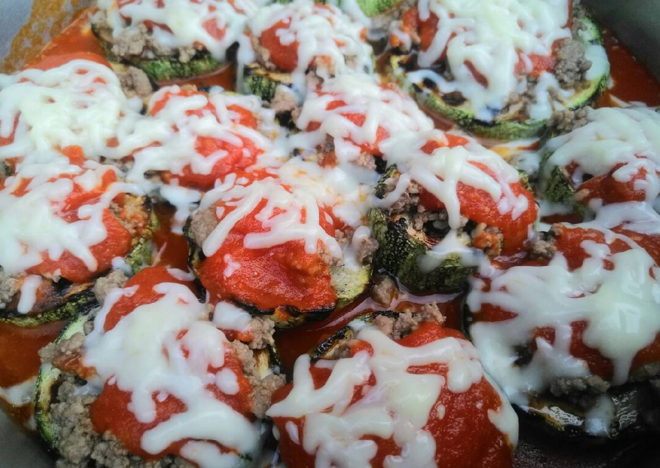 - Para armar el plato: en un pyrex o molde para hornear hacer una cama de la salsa en el fondo del pyrex o molde, acomodar las rebanadas de Zucchini, luego cubrir cada rebanada con suficiente carne molida que la cubra completamente, eventualmente cubrir con el resto de la salsa de tomate, cubrir cada una también con el queso que les guste, el queso para pizza es ideal o parmesano o el que tengan que se derrita, poner el pyrex en el grill con la tapa cerrada o lo para derretir el queso.