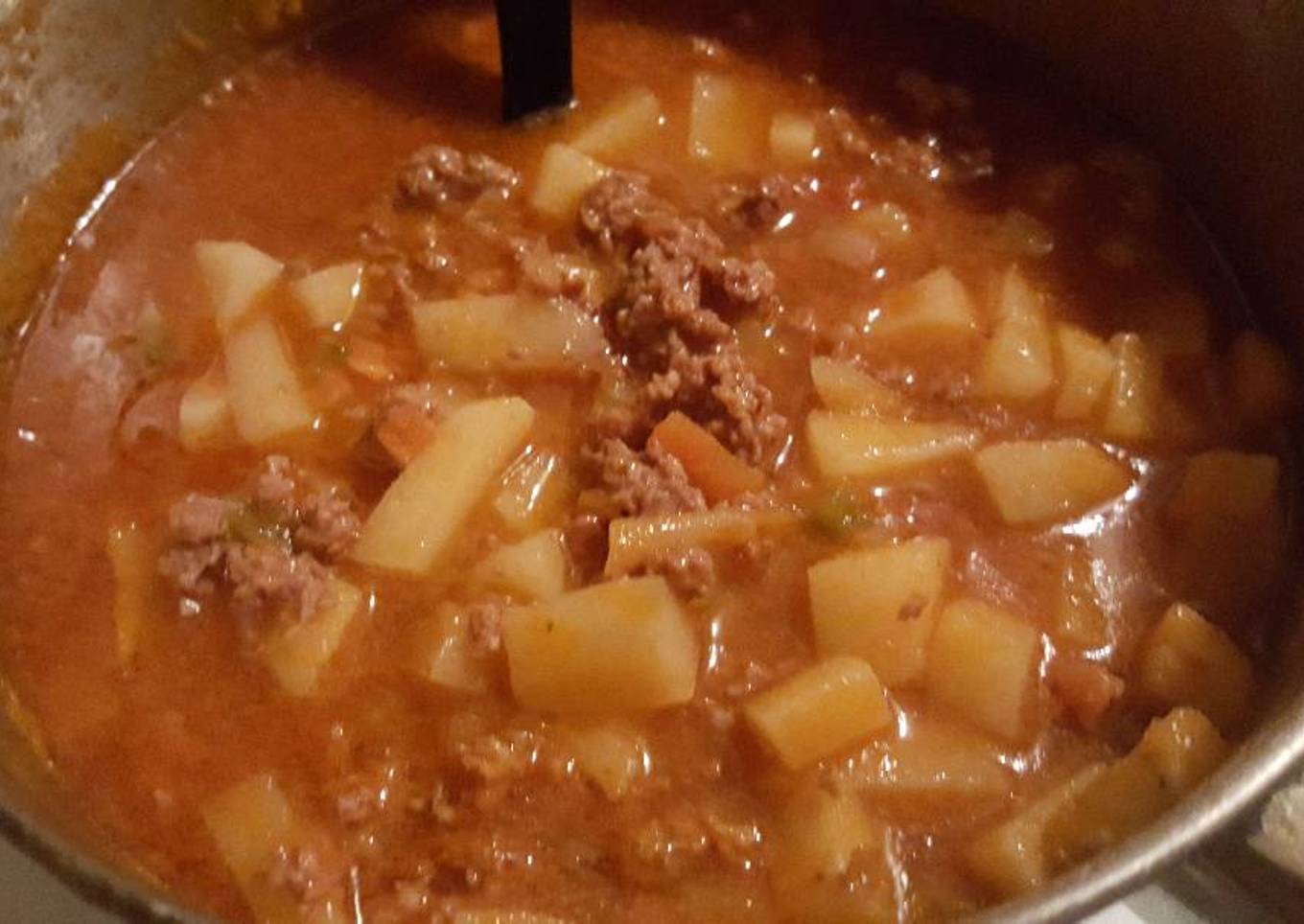 - Seguido agregamos nuestra carne molida y la desmoronamos con la cuchara para que se fría y revuelva con las papas y los vegetales y cocinamos sin dejar de mover por unos 3 minutos a fuego medio.