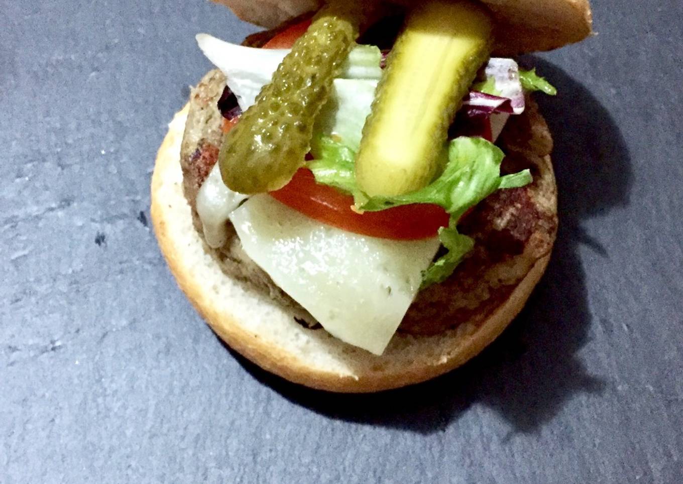 - Ya hecha la carne, calentamos un poco el pan. Para montar la hamburguesa añadimos primer la hamburguesa de queso, seguidamente, el tomate y la lechuga y coronamos los con los pepinillos.