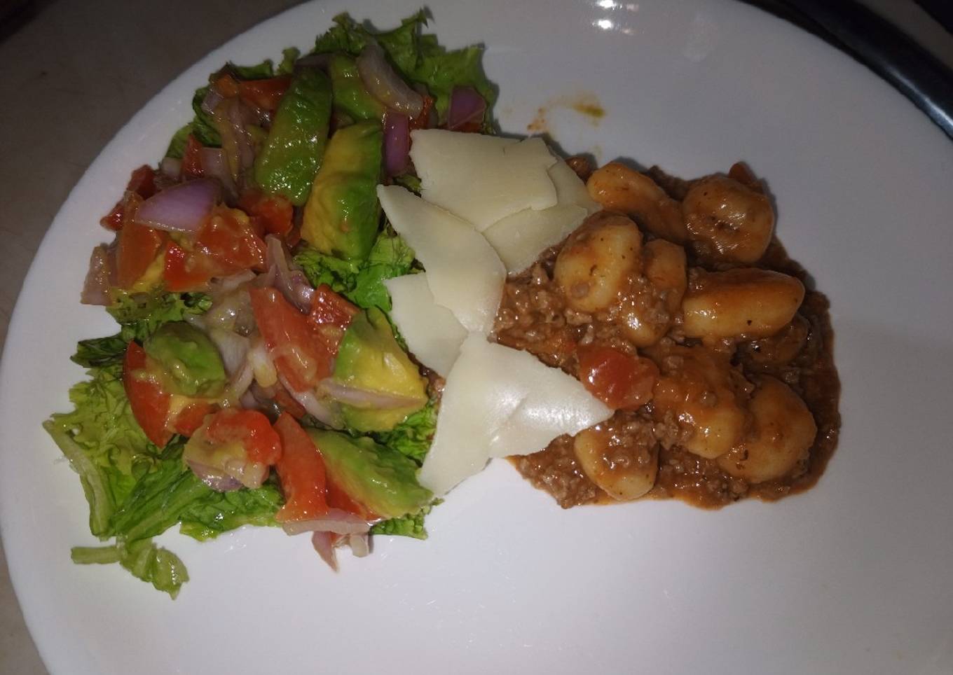 Ñoquis con carne molida y ensalada