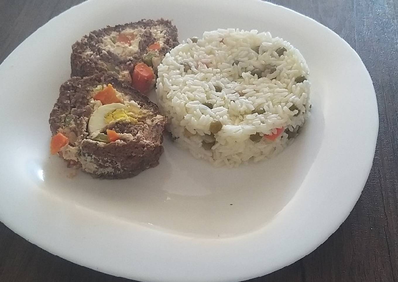 - Cortamos el arrollado en rodajas y lo servimos con un arroz blanco con guisantes
