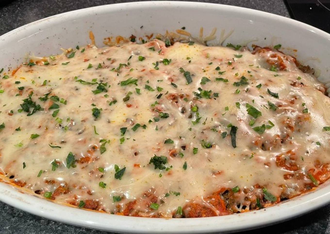 - Cogemos un bandeja del horno, colocamos las patatas encima la carne, la salsa de tomate y el queso, tapamos la bandeja con papel vegetal y papel del horno y la metemos en el horno a precalentado a 180 grados de calor arriba y abajo durante 15 minutos.