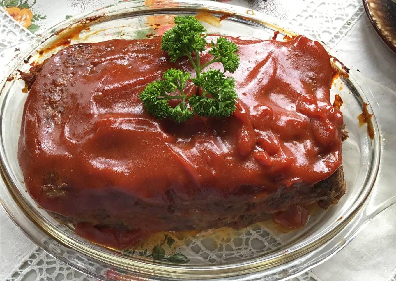 - Se introduce en un horno precalentado a 375º F (190ºC) durante 45 minutos. Una vez listo se pone en un plato plano refractario. En un bol se mezcla la salsa ketchup, mostaza y azúcar morena se esparce por encima de pastel y se introduce nuevamente en el horno por 10 minutos. Yo lo serví con puré de papas y tortitas de espinaca.