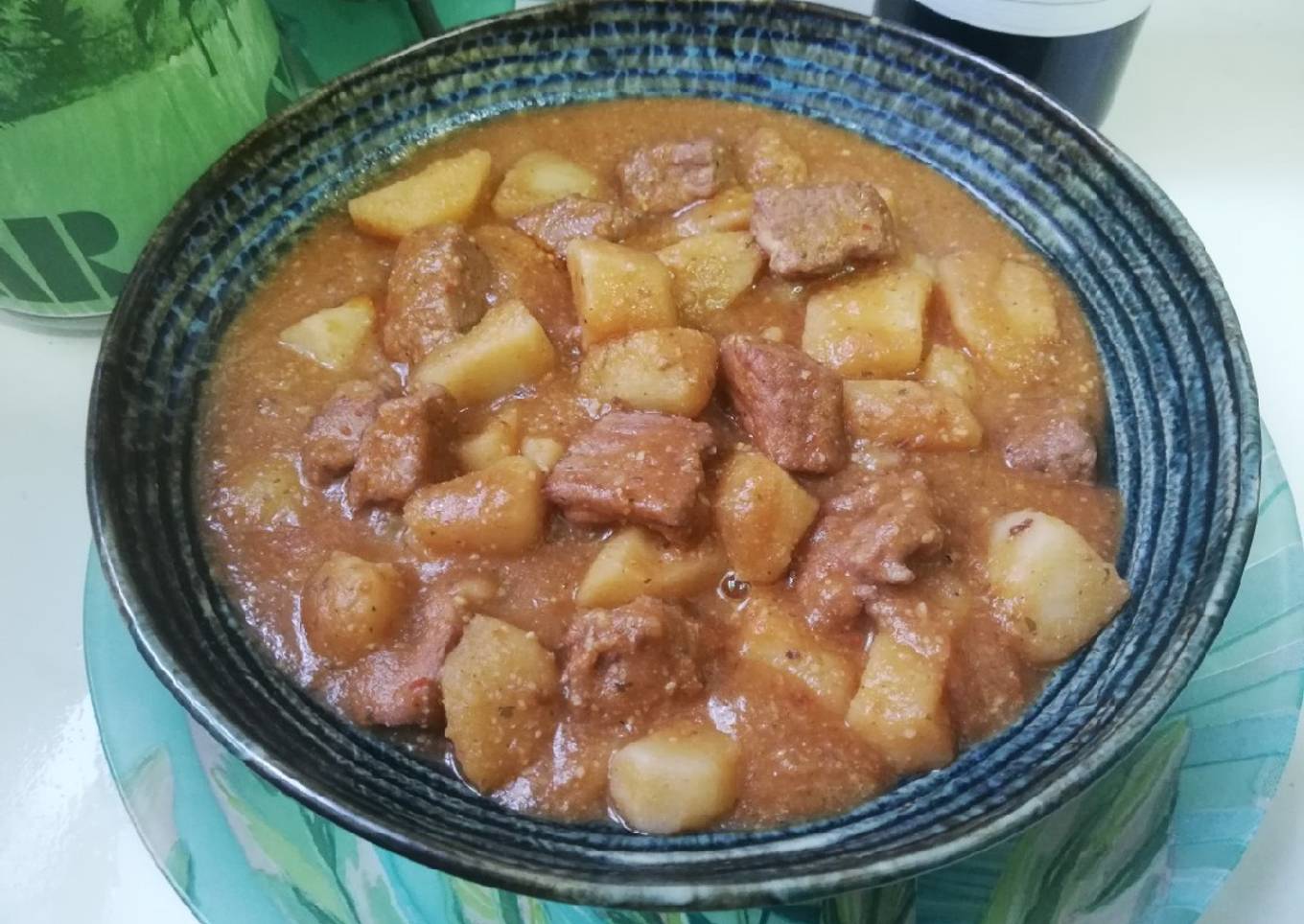 - Dejamos que cocine a fuego medio el guiso para que evapore el alcohol y lo tapamos hasta que la carne y las patatas estén bien tiernas.